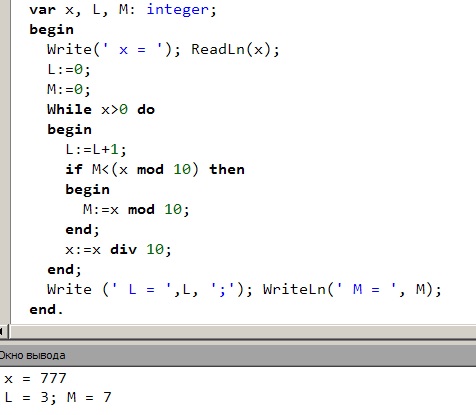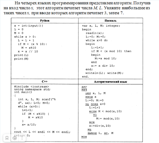 Главная » wiki » Помогите решить по информатике Помогите решить по информатике wiki На чтение 1 мин Просмотров 36 Опубликовано 23.02.2023 Вопрос: Ответ: M = 3 (x – трехзначное число) L = 7 ( число сотен) Наибольшее x = 777